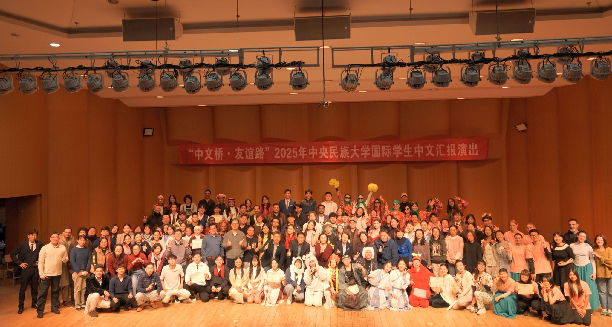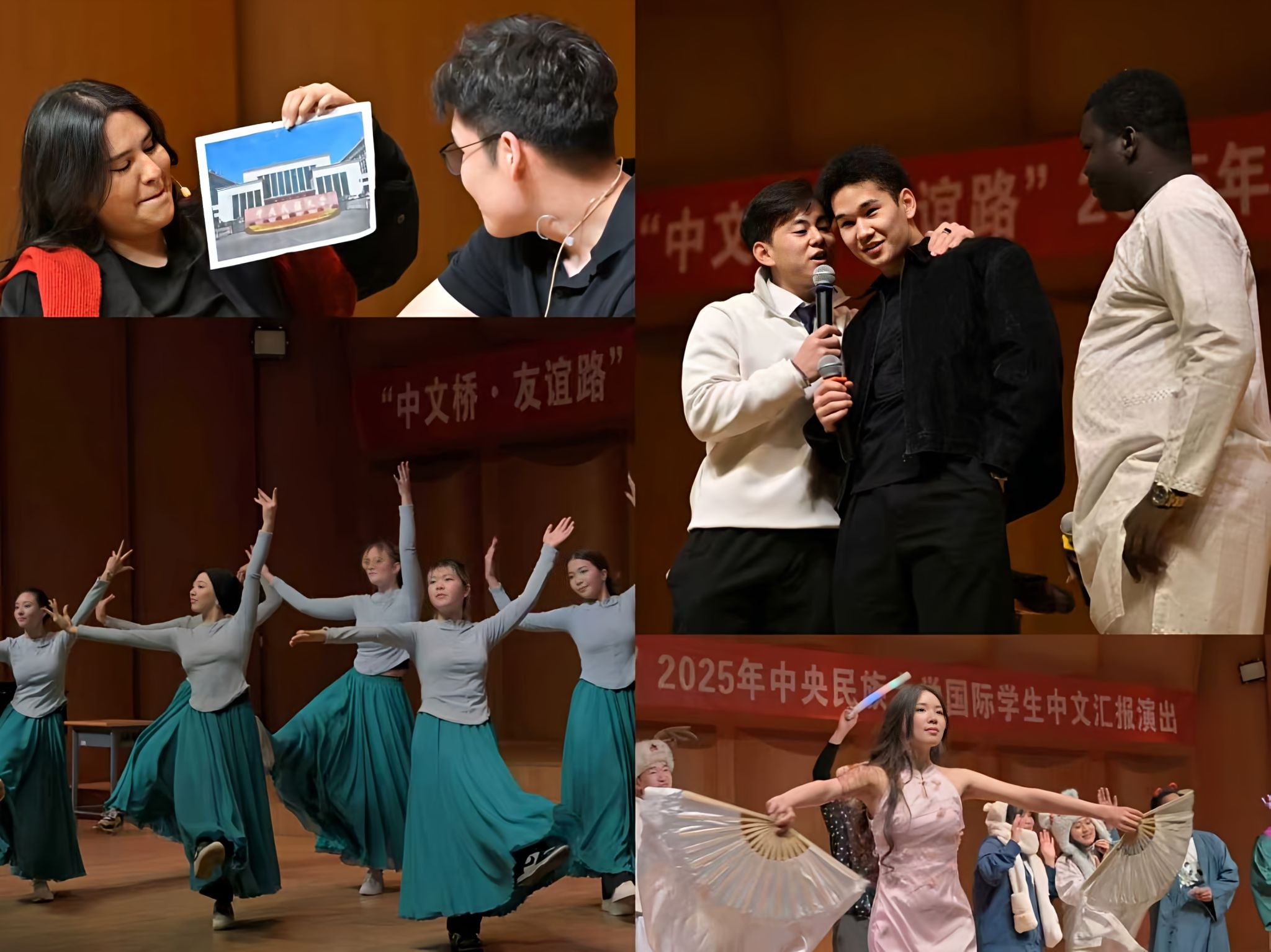 2025年12月29日下午,“中文桥·友谊路”——2025年中央民族大学国际学生中文汇报演出在海淀校区中慧楼音乐厅隆重举行。来自41个国家的国际学生以中文为桥,通过情景剧、小品、歌舞等形式,展现了中文学习成果与跨文化风采。教务处副处长高志强、保卫处副处长庞建超、国际教育学院党委书记周铁海、院长陈天序、副院长江傲霜,以及学院全体教师与近300名中外学生共同观看了演出。